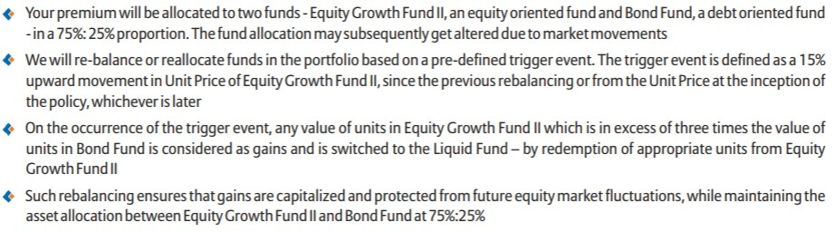 In a trigger portfolio strategy, the premium is distributed amongst two funds – equity fund and income fund. Once the funds are allocated, you don’t need to keep continuous track of your ULIP performance. They’re auto-allocated based on a pre-defined trigger event. An example is shown in the image below