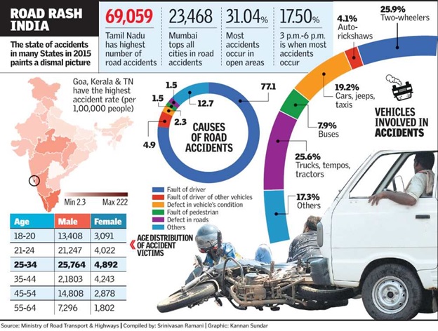 Road Safety in India is a major issue and reports state that over 5 lakh road accidents happen every year, which results in more than 1.5 lakh individuals losing their lives. Here is a report released by the Ministry of Road Transport and Highways in Jun 2016 (Ref Hindu) road rash in India is as follows